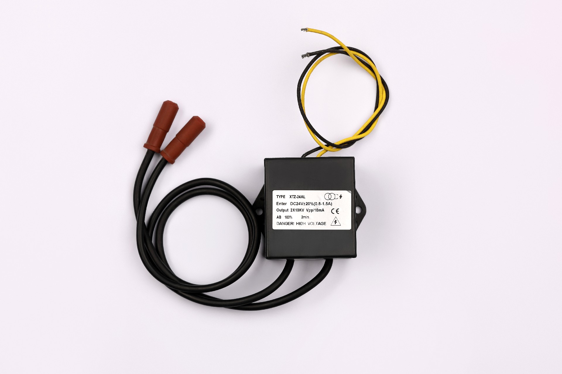 用途:燃油燃气加热器、厨房设备等点火。技术参数:输入:DC 24V 连续点火0.4~0.5A,间隙点火0.8~1.2A 输出:≥15kV 外形尺寸:95×80×62mm点火距离:3~5mm3分钟点火有效率:33%、100%外形及安装尺寸:注意事项:使用时输入双色线必须良好接地!